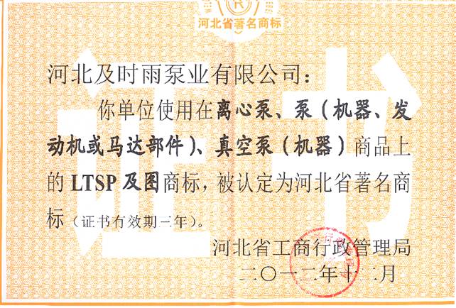 及時雨品牌被評為河北省商標(biāo)-河北及時雨泵業(yè)有限公司